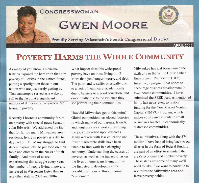 Today, Congresswoman Gwen Moore’s news letter came in the mail. The lead column is titled Poverty Harms The Whole Community, in which she talks about the struggle that people in poverty have, and how hard it is for lower skilled and less educated workers to find decent paying jobs in Milwaukee.