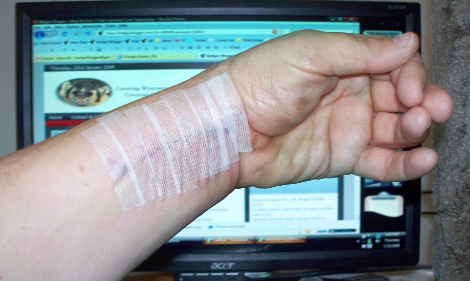 Since the stitches were so uncomfortable, he pulled them (7) and took off that ungodly uncomfortable splint. I am now in an elastic glove sort of thing with a molded aluminum bar to hold my wrist in the proper position. Except for therapy (2x per week)and showering I will keep this on 24-7 for the next 4 weeks.