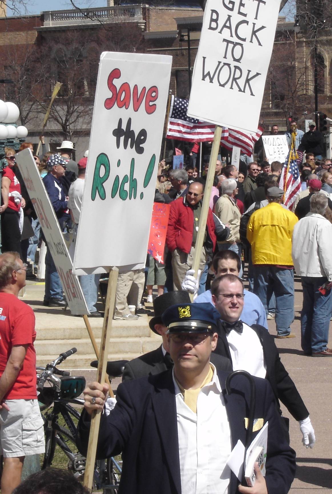 QUESTION: The nimrod in the front, as seen here with the “Save the Rich” sign, is a paid political hack…can you name him? The first BadgerBlogger visitor to correctly name the nimrod will win their choice of either an autographed photo of Herb Kohl or George & Laura Bush, if I still have them in my basement. (Sorry Bruce, Glenn and Patrick…only our visitors are eligible.)