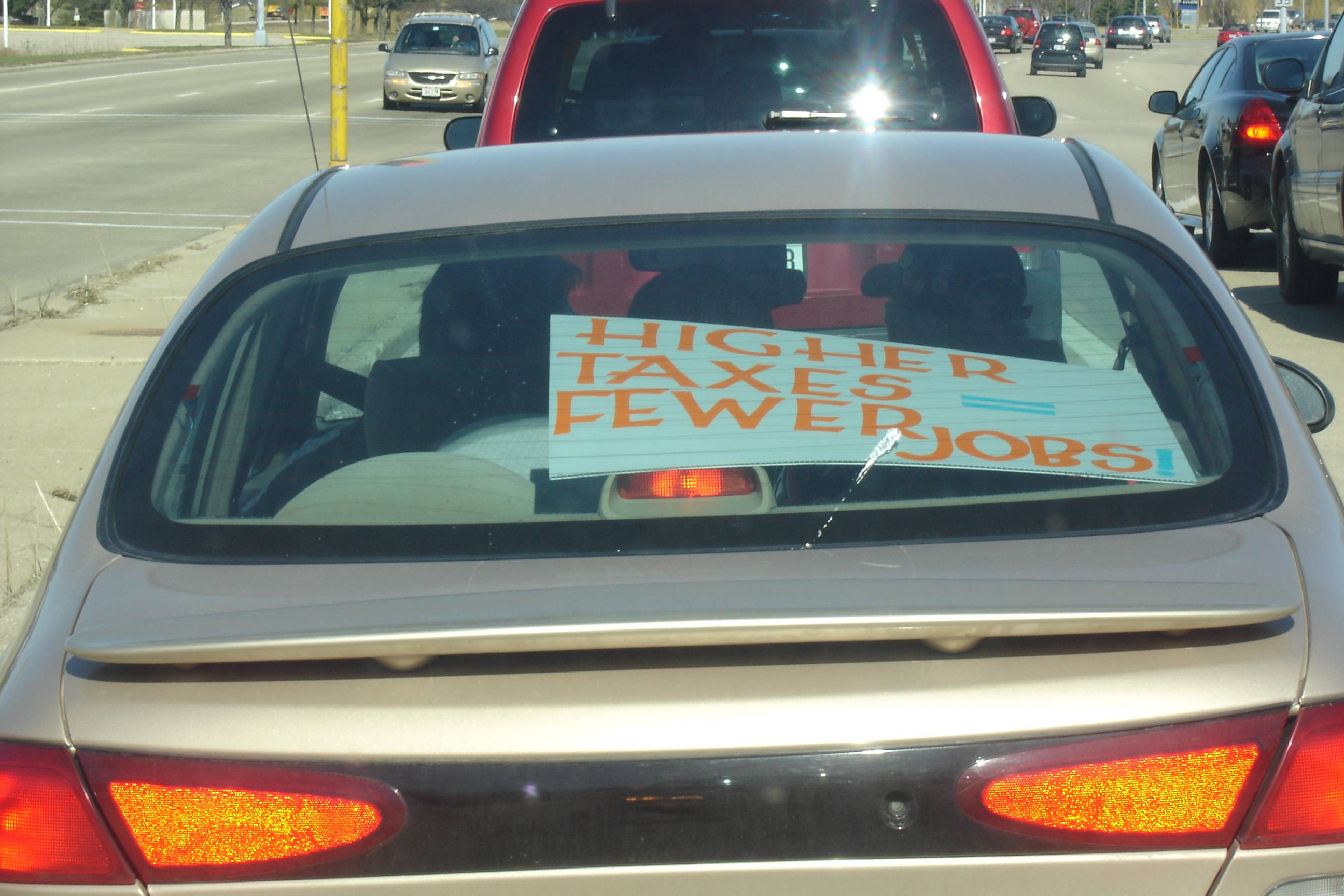I travelled to Madison by car with the lovely Mrs. Melnick today. She having the week off being that she is a school teacher, while I took a personal day off from work. Taking I-94 West, we saw many a car with people holding signs. This one, I honked the car horn and exchanged friendly waves…they threw one sign up in the window. Snapped this shot as we arrived at the Alliant Center: