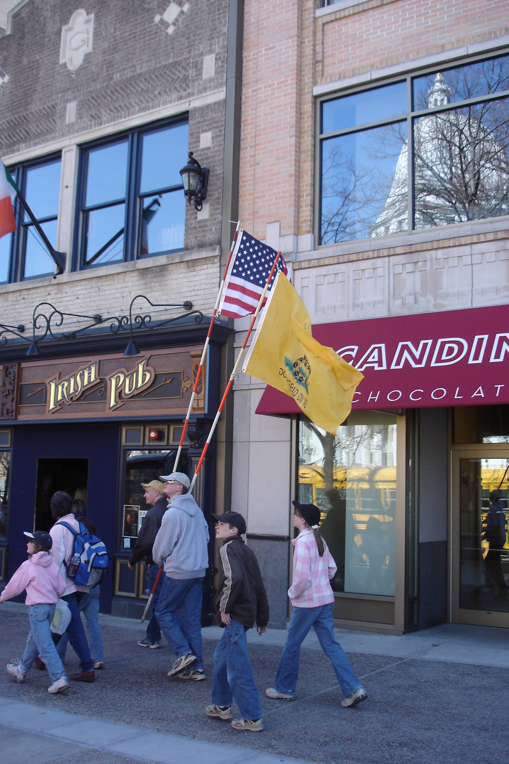 Rather than wait…we joined a group of folks who decided to walk the 2 1/2 miles to the Capitol Building. Along the way, we met up with an Economics teacher from my wife’s school…I’ll leave his name out to spare him any ostracism/reprisal from any of his peers. It’s been a while since old Melnick has been to something like this, but it was fun meeting folks. Was envious of those with “Don’t Tread On Me” flags, my personal favorite:
