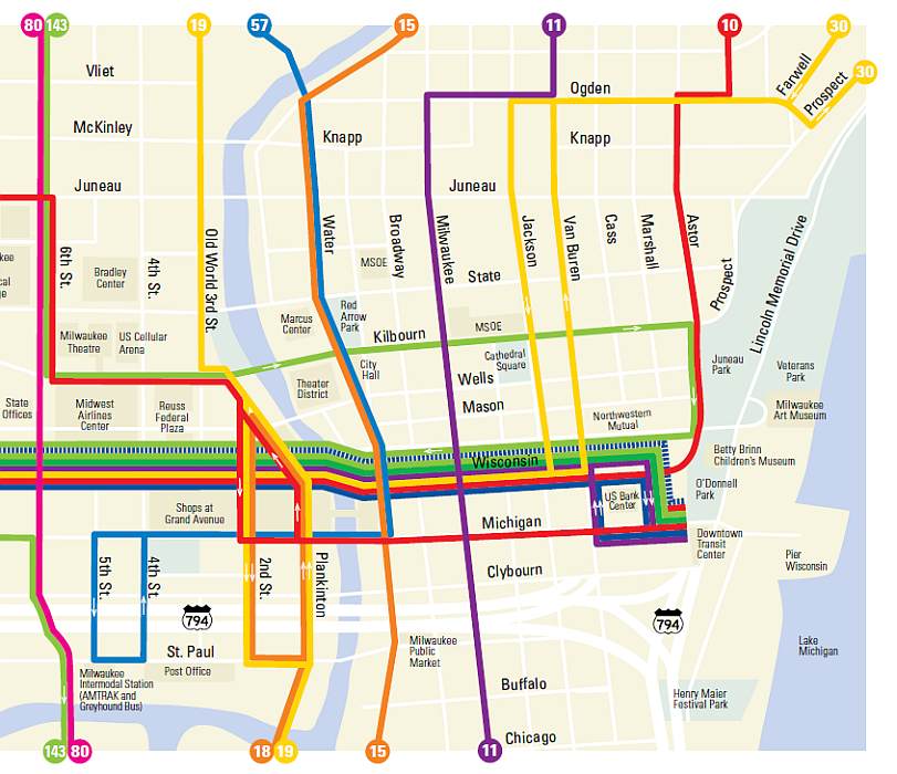 Speaking of Route 15, Google Maps says it should take about 5 minutes to walk from State/Water to the Bradley Center, 5 minutes from Kilbourn/Water to the Arena, 6 minutes from Wisconsin/Water to the convention center, and 8 minutes from St. Paul/Water to the train station. All of those distances are less than a half-mile from existing MCTS bus stops.