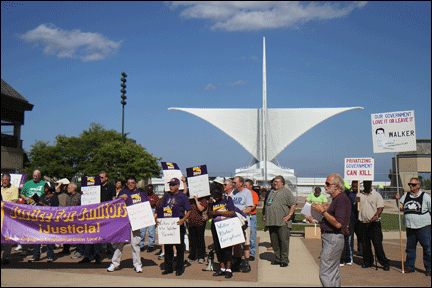 Seeing the SEIU listing brought me back to what bothered me about Larson. In the wake of a real tragedy, the 15 year old boy who died after a massive concrete facade fell off the O’Donnell Park parking structure across the street from the Milwaukee Art Museum, Milwaukee County Supervisors John Weishan, Chris Larson and Marina Dimitrijevic led a march that was organized at the Milwaukee office of the SEIU (Service Employees International Union) and tangentially supported by other labor types. Quick to make political hay out of the teen’s death, these heartless pols teamed up with a labor union that wanted to exploit the kids death in order to pressure the County into hiring more into their ranks as evidenced by the “Justice for Janitors” banner appearing at the O’Donnell Park rally.